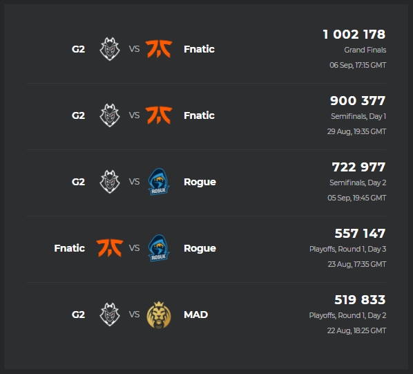 이 정도 시청자수를 기록하는 한국 스포츠 컨텐츠는 거의 없습니다. 여담 편집 중국에서 개최되었던 2017 월드 챔피언십 기간 동안 리그 오브 레전드는 전통적인 주요 스포츠 이벤트에 필적할 만큼 획기적인 신규 시청자 수를 기록했습니다. 2014년 롤 올스타때는 70만명도 훌쩍 넘어섰다고합니다.